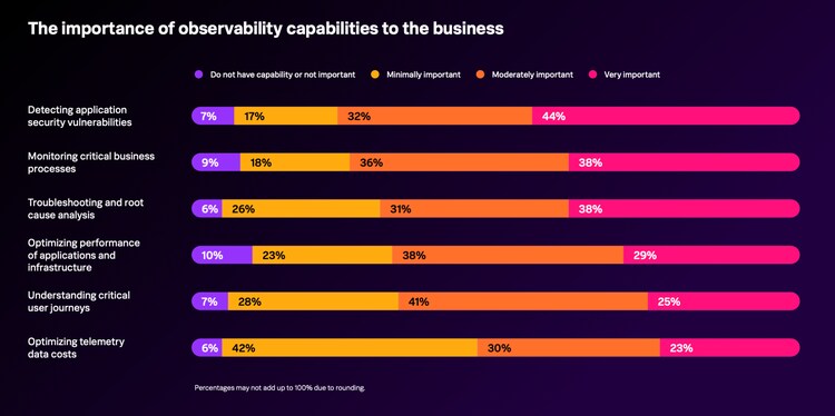 Forward-looking organizations are increasingly leaning on their observability practice to solve a greater variety of challenges and goals, including making it a top priority to capture business metrics. In fact, 74% of respondents say that monitoring critical business processes is moderately to very important.