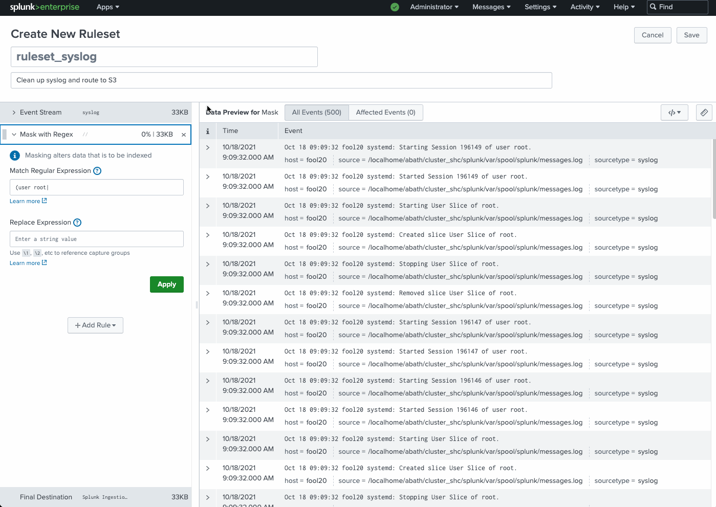 Data masking, filtering and routing are all done with simple clicks — no writing command lines, or hand-writing stanzas in configuration files. A common use case we see for data masking is removing sensitive information such as user names. With the new Ingest Actions feature, you simply click to add a new rule, specify what needs to be redacted, and the expression you want to mask it with. You can iterate quickly and validate rules before deploying it in a distributed environment.