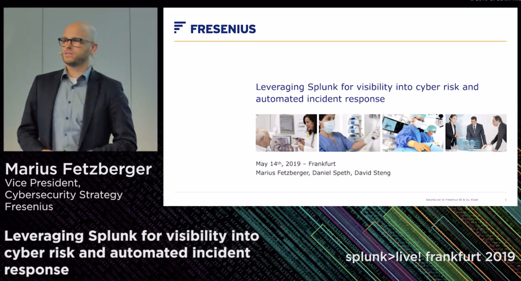 Marius Fetzberger, VP Cybersecurity Strategy Fresenius, shared the security challenges being faced and how the team is set up. The big question is: “Where should we focus first?” David Steng, Senior Manager Cybersecurity Economics, is tasked to make cyber security and cyber risk transparent to the CFO and board of directors. For this, they created a Fresenius Global Risk Score and shared the methodology of how it is calculated and the use of Splunk Enterprise Security. Also on stage, Daniel Speth, Senior Manager Cyber Analytics and Response shared how Fresenius uses Splunk Phantom for security automation and Ransomware use cases.