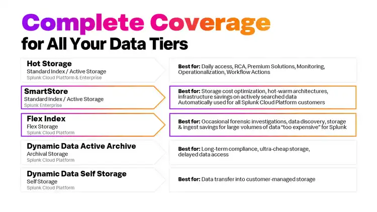 With the introduction of Flex Index and SmartStore for Azure (along with our existing S3 data routing capabilities), we have rounded out our tiered indexing and storage options, providing value-appropriate coverage for all of your data tiers.