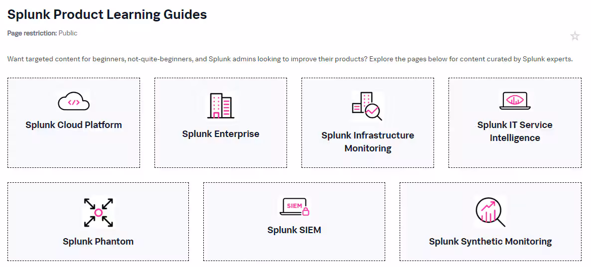 The Getting Started product learning guides walk beginners through the vast world of Splunk resources. They point novice Splunk users to the most useful Splunk Docs, blogs, education courses, Tech Talks, and other Splunk Lantern articles related to specific product features or functionality. More advanced articles give practical recommendations to administrators on how to improve product performance, increase productivity, and resolve common problems or concerns.