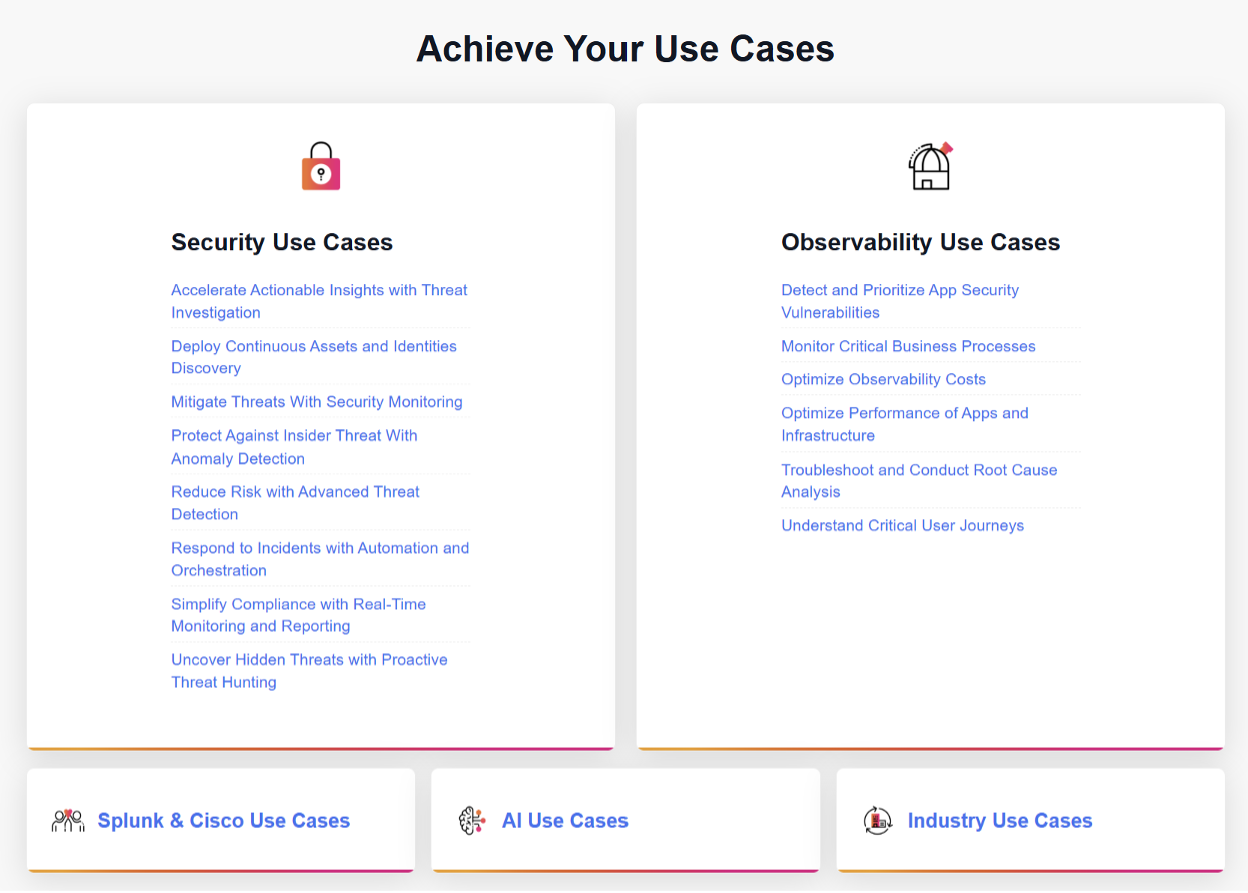 First we’ve brought the use cases front and center, to the top of the Lantern home page. You’ll find some old, high-value favorites, like Security Monitoring and Troubleshooting, and you’ll find some new use cases that will help you mature your organization and take control of costs. For example, why not check out Deploy Continuous Assets and Identities Discovery or Optimize Observability Costs? Plus, we’ve made all our Splunk + Cisco use cases and our artificial intelligence use cases easy to find, right from the home page.