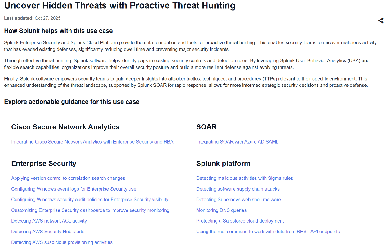 What’s more is that use cases are now sorted by product. When you click into any use category from the home page, you’ll see all our available guidance, organized by Splunk product. This helps you more quickly find information relevant to your environment, while still being able to see what other steps you could be taking if you expanded. Oh, and did you also notice the “last updated" date beneath the article title? We added that highly requested feature to our articles, so you can trust that you’re getting content that’s been recently reviewed by our crowdsourced experts.