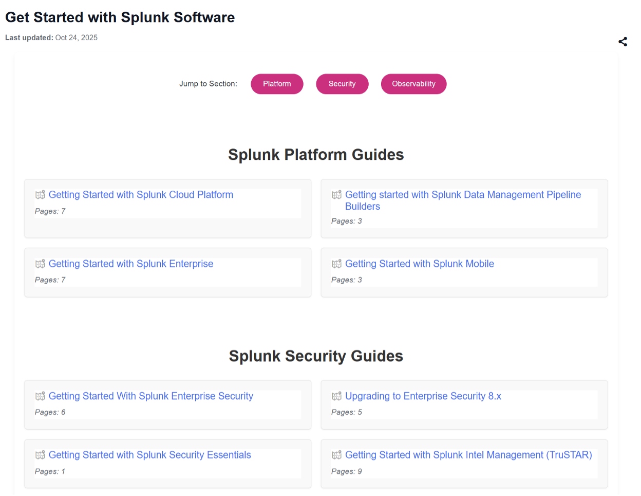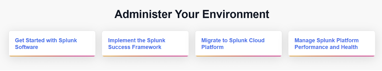 The next section on the home page is all about Splunk administration. Again, you’ll find tried-and-true favorite content like Getting Started Guides, the Success Framework for Splunk program managers, and the Splunk Cloud Migration learning path. You can get to all this great content with fewer clicks, especially those Getting Started Guides, which are now all on a single page, instead of split by solution area.
