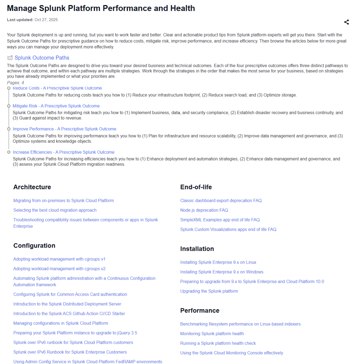By now you might be wondering where our old Product Tips sections have disappeared to. Well, some of the content has been aligned with the new use case categories. But the most important administrative best practices that we’ve gathered from Splunk experts can be found in Manage Splunk Platform Performance and Health. Here you’ll learn how to optimize your Splunk platform configurations, performance, security, cost structure, and more.