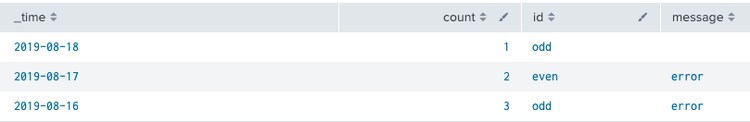 | gentimes start=-3 | eval _time = starttime | fields _time | sort - _time | streamstats count | eval id = if(count%2=0, "even", "odd"), message = case(count>1, "error")