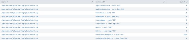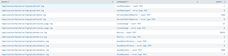 index=_internal | stats count count(eval(log_level="ERROR")) as error_logs by source component|xyseries source component count error_logs format="$VAL$ - $AGG$ TEST" |untable source component count