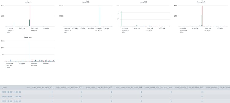 In the search above, we are creating new fields created from the existing field name concatenated with _curr_kb. An example of the new fields is indexqueue_curr_kb, because indexqueue is a value of the name field. The values of these new fields come from the current_size_kb field. The reason this command works here is that you cannot have multiple fields in the by command for a timechart, but you want to have the data split by the name and the host.