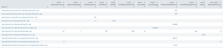 index=_internal | stats count count(eval(log_level="ERROR")) as error_logs by source component|xyseries source component count error_logs