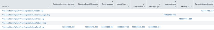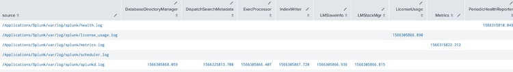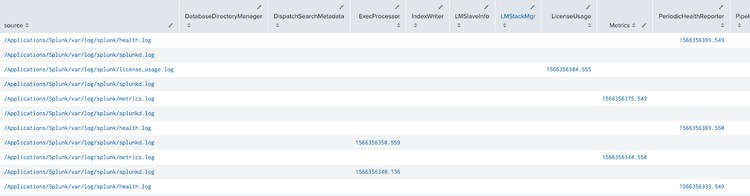 index=_internal component=* |fields source component _time|sort 0 source component|xyseries source component _time grouped=t|table source *
