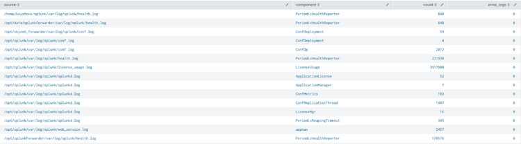 index=_internal | stats count count(eval(log_level="ERROR")) as error_logs by source component|xyseries source component count error_logs
