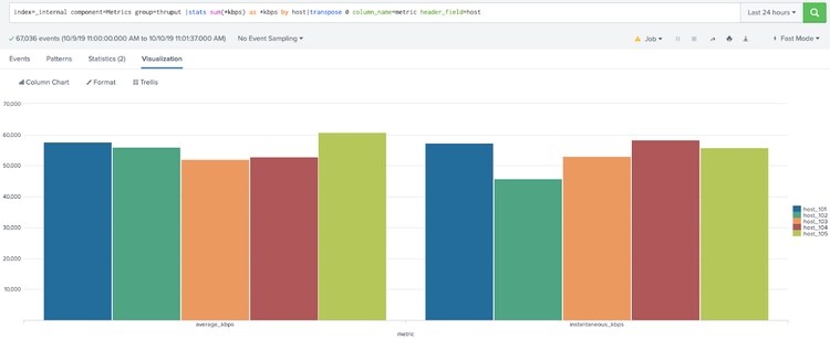 By adding transpose to this search, the visualization groups the metrics together instead of the hosts, which allows for host over host comparison of the same metric. Without the transpose command, the chart looks much different and isn’t very helpful.