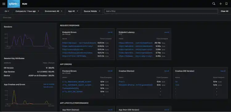 Splunk’s Mobile RUM quickly shows performance across your entire stack, from crashes and mobile performance on the client side, to errors or latency from database calls in your backend services. Within Splunk’s Observability platform, it helps you analyze and improve user-experience in context across your entire environment.