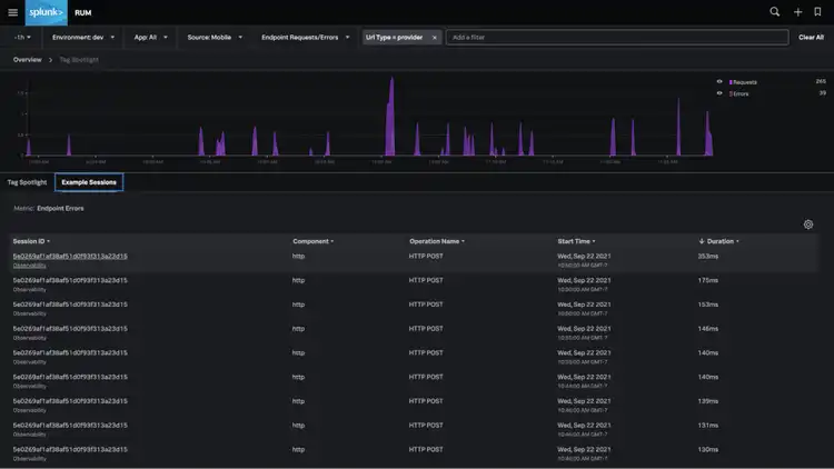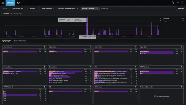 By clicking into “Endpoint Errors” we’re taken into Splunk’s tag spotlight feature which helps identify and correlate problems across dimensions in our environment like OS, OS version, App, App version, device, URL, and more, as we isolate issues across our environment.