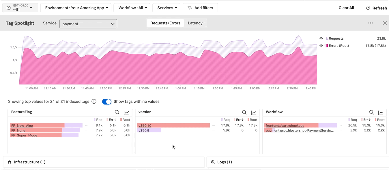 Upon analysis of Tag Spotlight, it becomes evident that every request to the latest version of the payment service (version 350.10) results in an error, signaling its unpreparedness for Production.