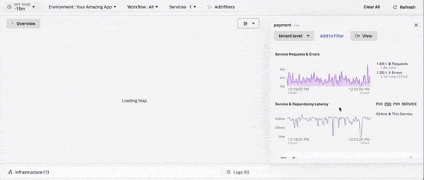 The alert indicates the issues are stemming from the Development environment, so you begin by narrowing your focus. With Splunk Observability Cloud, you have the flexibility to toggle between different environments like Development, User Acceptance Testing, Quality Assurance, and Production or view the health of environments collectively. Leveraging Splunk Application Performance Monitoring (APM)'s user-friendly Service Map visualization, you easily hone in on the payment service, launching your investigation with precision.