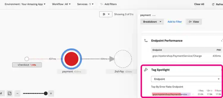 Upon analysis of Tag Spotlight, it becomes evident that every request to the latest version of the payment service (version 350.10) results in an error, signaling its unpreparedness for Production.