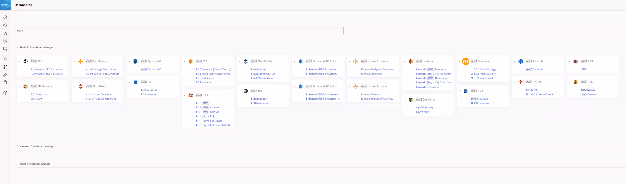 Figure 9: AWS built-in dashboard groups in Splunk Observability Cloud