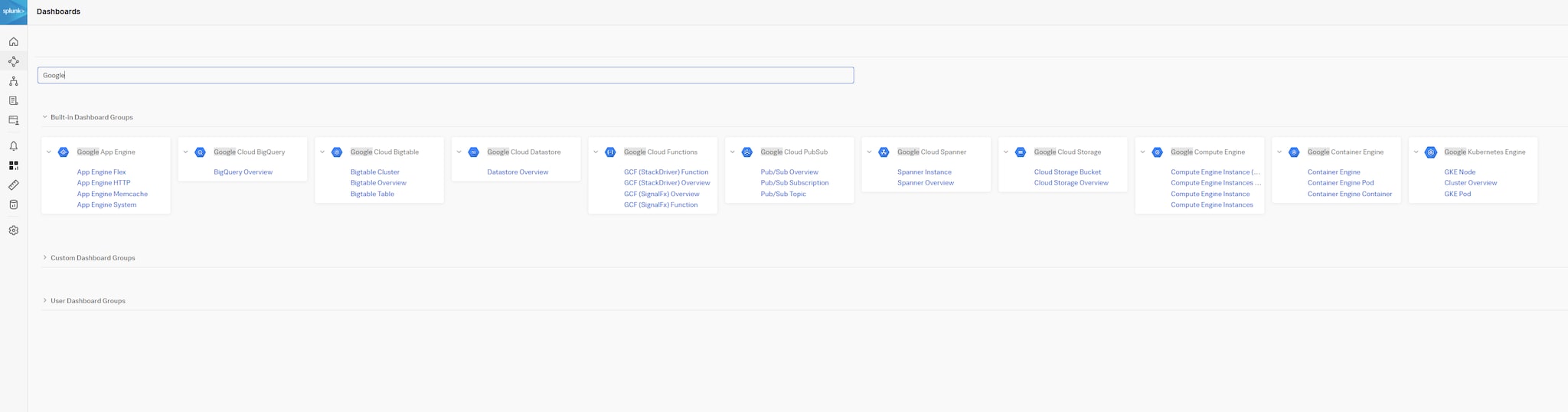 Figure 10: Google Cloud Platform built-in dashboard groups in Splunk Observability Cloud