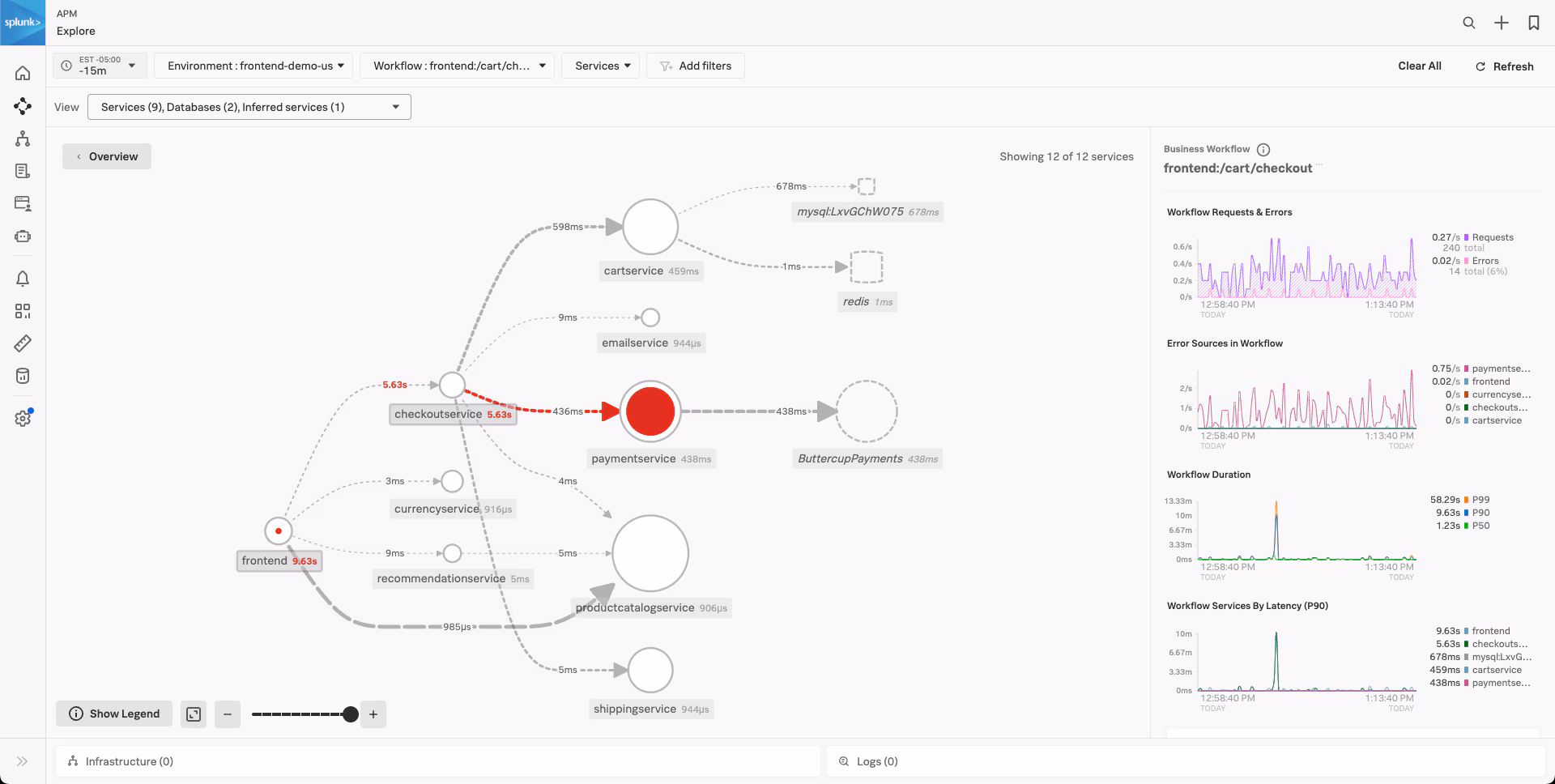 In this example, a Business Workflow has been configured to monitor the checkout process for an online retail store, which is a critical business transaction. Using the Business Workflow, only the services that are involved in the checkout process are focused, eliminating noise and minimizing complexity. This allows SREs and service owners to not only understand that the payment service has a high error rate (as indicated by the giant red circle in the service map), but also these errors are directly affecting the checkout process.