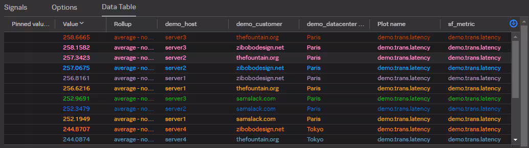 Say we have a metric called demo.trans.latency that simulates service latency that gets used by three customers globally and is hosted within multiple data centers. With all the metadata we have for the metric, splitting it by those dimensions we’d get 18 Metrics Time Series (MTS) as pictured in the Data Table. Think of MTS as the underlying rows that form a given metric and all of its unique dimensions. For example, we could summarise the max CPU utilisation of our entire tech stack and it would be a single MTS. This wouldn’t go a long way in helping us to identify or resolve particular infrastructure issues. Instead, we could aggregate by availability zone. If we were hosted across three zones, then our MTS would be three. What we really need to know is which host specifically is experiencing issues. In this case, we’d aggregate down to the host level. Our MTS count is the same as the number of our hosts in this case, which, hypothetically, is 100.