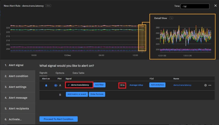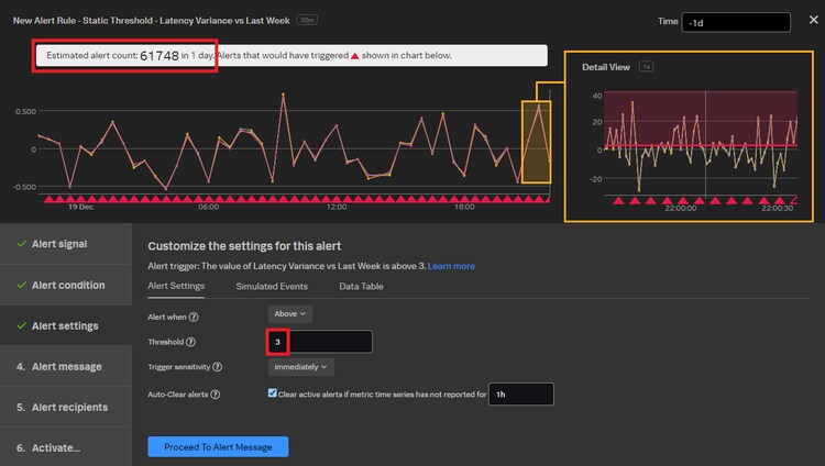 Once we select Static Threshold, we then specify what we want that threshold to be. Setting the threshold to three, we’ll be alerted when the service latency experienced by each of our customers is three milliseconds (ms) slower than it was the previous week. You’ll notice in the time chart that setting a 3ms threshold would have resulted in more than 61,000 alerts on the previous day had this alert been active. That’s beyond even ‘alert noise’ at that point! We’d customise this even further to keep our team happy and our email service functioning.