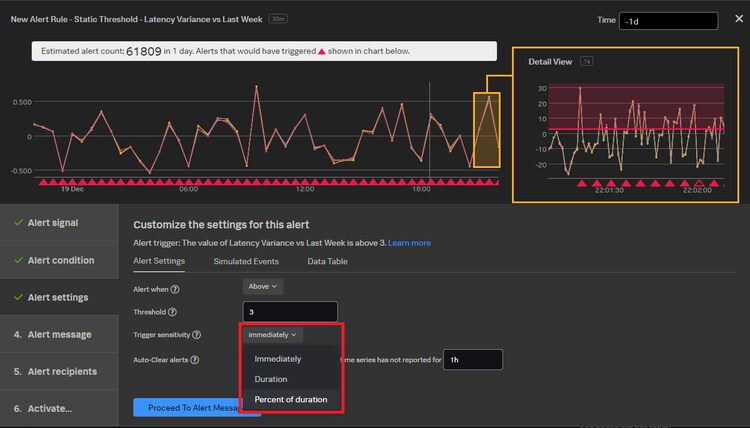 In this example, we see that the dataset is quite ‘spiky’ - constantly peaking above the threshold before coming back below the 3ms mark. Since we’re not concerned about the behaviour in such a fine-grained resolution and are more interested in how the latency is trending, we can customise this even further to make it much more relevant and meaningful for our team. A great way to take this to the next level is by changing the Trigger Sensitivity from alerting on any immediate breach of the threshold to only alerting when there is a substantial period where the latency is slower than the previous week.