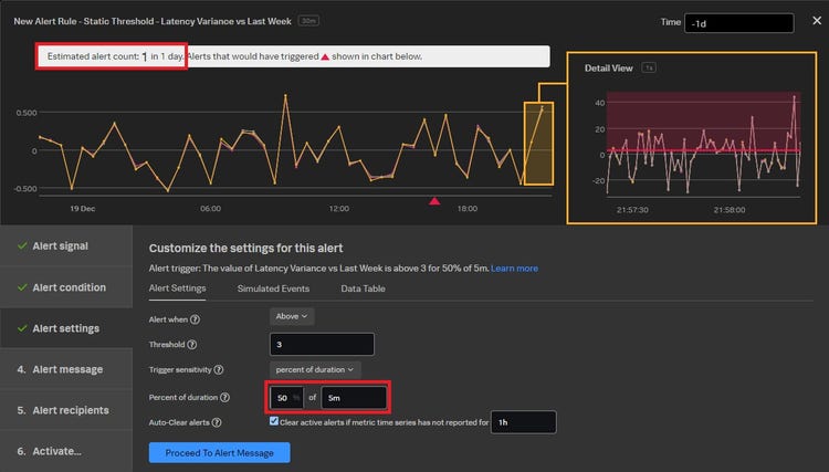 Now, we’d specify that we only want to fire an alert if our latency exceeds the threshold for at least half (50%) of a five-minute window. Accommodating for a spiky dataset and customising the threshold to look for a trend brings the number of simulated alerts over the previous day down from over 61,000, to just one. Our customisation has made what would have been an unusable detector into something valuable and meaningful for the team!