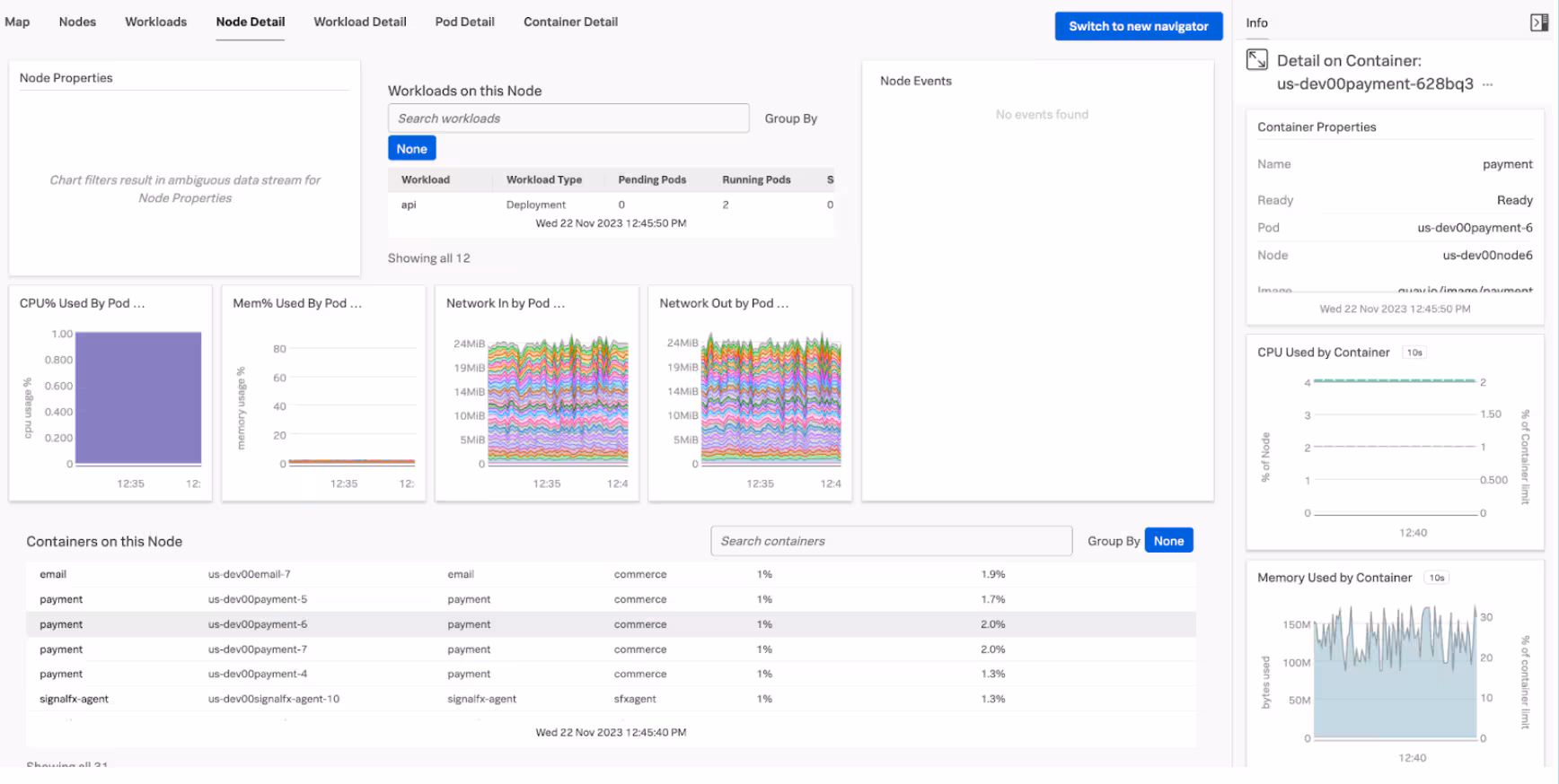 Your engineering teams will gain detailed visibility into your Kubernetes clusters down to node details. Selecting a specific Node for this view navigates to an OOTB dashboard with details on the health of the server.