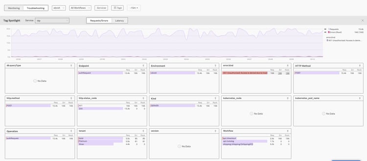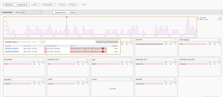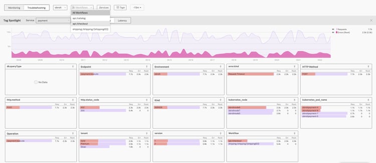 With these capabilities, once there’s a problem with a business workflow, SREs can use Tag Spotlight to quickly see which service is causing it, who is impacted and involve only the relevant team instead of having everyone waste their time by joining a war room. The developers in charge of the problematic service can then use Tag Spotlight themselves to quickly understand what caused the issue and start troubleshooting it.