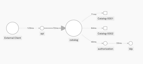 Consider the application below — it is performing two main functions: catalog and checkout. However, there is only one entry point into the system — the API service. Measuring the latency and error rate of the API can provide some information, but cannot provide business and engineering leaders with insight as to how checkout-related transactions or catalog-related transactions are doing. Similarly, from the perspective of the developers, the teams that own the Authorization and the Idp services, which are used by both types of transactions, need to understand how their services are impacting these two KPIs.