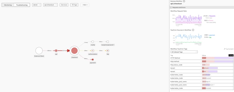 Image 6: Top error tags associated with the Checkout business workflow. On the bottom right it seems like kubernetes node 6 is the culprit…