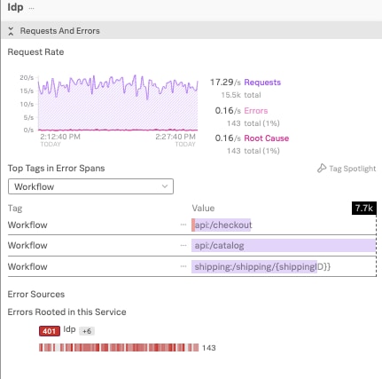 Business Workflows help business leaders and DevOps use the same language, but we didn’t stop there. Once an issue is detected, Splunk APM leverages Business Workflows to help SREs and developers troubleshoot the problem faster. In the example in Image 1, the red dot in the API service indicates a problem. Image 2 shows that there are no problematic traces in the Shipping or Catalog workflows (no red dots), and that all the problems originate from the Checkout workflow. Even in this simple example, you could have probably eyeballed that the majority of errors come from the Checkout business workflow, but it is not obvious at all that there would be no errors in the Shipping workflow. The problem becomes even more acute when you have a much more complicated service map with hundreds of services. That is why the ability to filter the service map based on workflows gives DevOps teams a powerful tool to see all the services that are involved in each kind of transaction, to understand issues in their applications, and to more easily troubleshoot them. In order to simplify troubleshooting even more, once you choose a workflow, Splunk APM automatically surfaces top tags associated with its errors and latency: