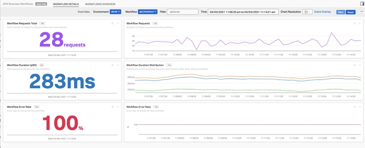 Business Workflows is a powerful, one-of-a-kind, tool to provide business and engineering leaders with visibility into how their applications are impacting business performance. It is purpose-built for microservices-based environments, and uses end-to-end traces to create accurate metrics to chart and alert on business KPIs. Developers and SREs can use Business Workflows to see the radius of impact of different services, and to quickly troubleshoot issues, no matter how complicated the app architecture is.