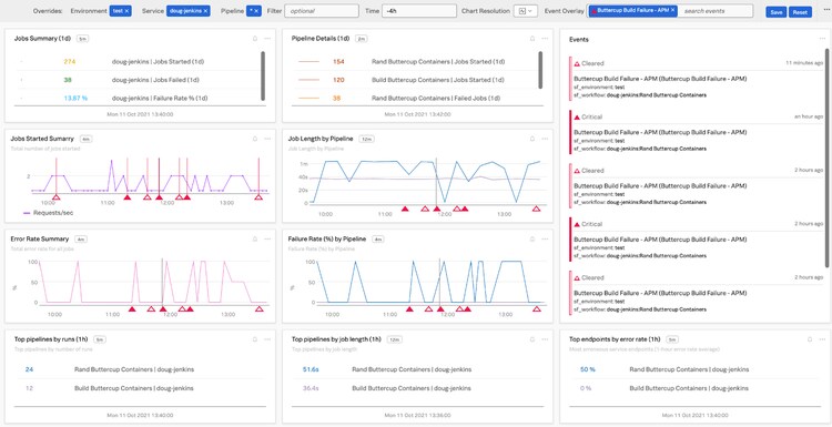 - Mean Lead Time for Changes: Knowing when you’re deploying is a crucial element of establishing the overall development time required to get a change from ticket inception to final deployment into production. Using your new Jenkins data in Observability Cloud along with some additional signals from other software like Jira and Github, you’re well on your way to establishing a trackable flow from ticket, to development, and on to deployment.