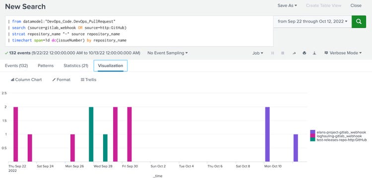 As I’ve stated before, the linking of the various SDLC components (planning to code, test, and release in this case) is perhaps the greatest value of a data model for DevOps. In this blog we’ve demonstrated how linking common fields like “issueNumber” from work planning to “commit_list” from code pushes and PRs creates a steel thread that can unlock previously unexplored relationships in the data. That commit hash data even provides a way to connect code through the build, test, deployment, and monitoring phases of the Software Development Life Cycle. This sort of connection even works backwards as well as forwards. For example, by knowing what the latest commit hash is of a build running in production — by including it as a log or metric attribute for example — operations and development teams have a precise definition of what code is being monitored, what PR it came from, and who committed it. Security or DevSecOps teams can also make use of this information and know if the currently deployed code contains the commits which fixed an important vulnerability.