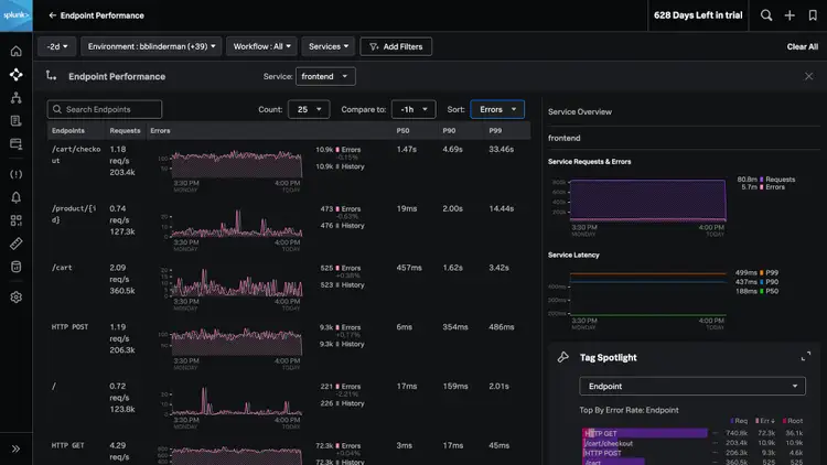 Engineers operating monolithic applications often struggle to identify problems across hundreds of endpoints. Splunk APM’s endpoint performance helps you easily explore and compare the performance of service endpoints. A centralized view shows you trends in latency and errors for all of your endpoints, ranked by error rate or latency. Advanced filtering helps you quickly sort by common endpoint paths (/payment/ for example). When an issue occurs, quickly scope the impact of a problem by seamlessly navigating to APM’s troubleshooting flows or specific traces. For more, see the docs.