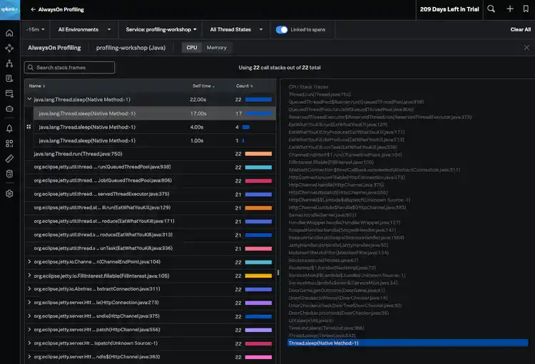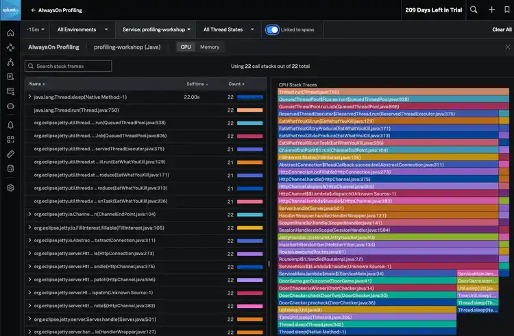 For additional troubleshooting information, teams implemented AlwaysOn Profiling with a simple update to the command line used to launch their application. After AlwaysOn Profiling was enabled, call stacks for the application services were available within Splunk APM.