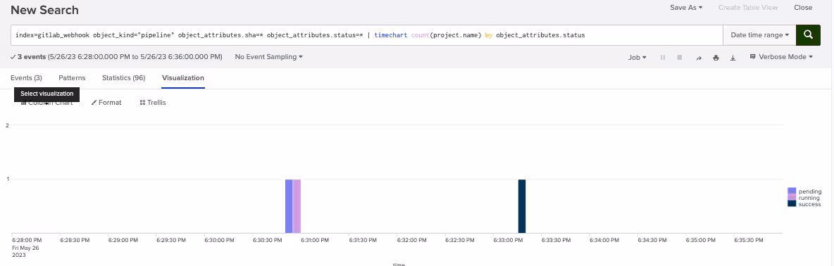 Once your CI/CD data from Gitlab (or any other place) is in Splunk the world is your oyster. Leveraging Splunk Dashboards and SPL you can easily observe deployments, code scanning results, and other important data at a glance! But before building anything, think about those questions listed earlier and pursue some of the easy ones. The easiest of these questions is determining when deployments started and finished. This can be accomplished with some very basic SPL to create a timechart. Knowing when deployment events happened allows you to more easily establish if a given deployment was involved in or precipitated an incident or outage.