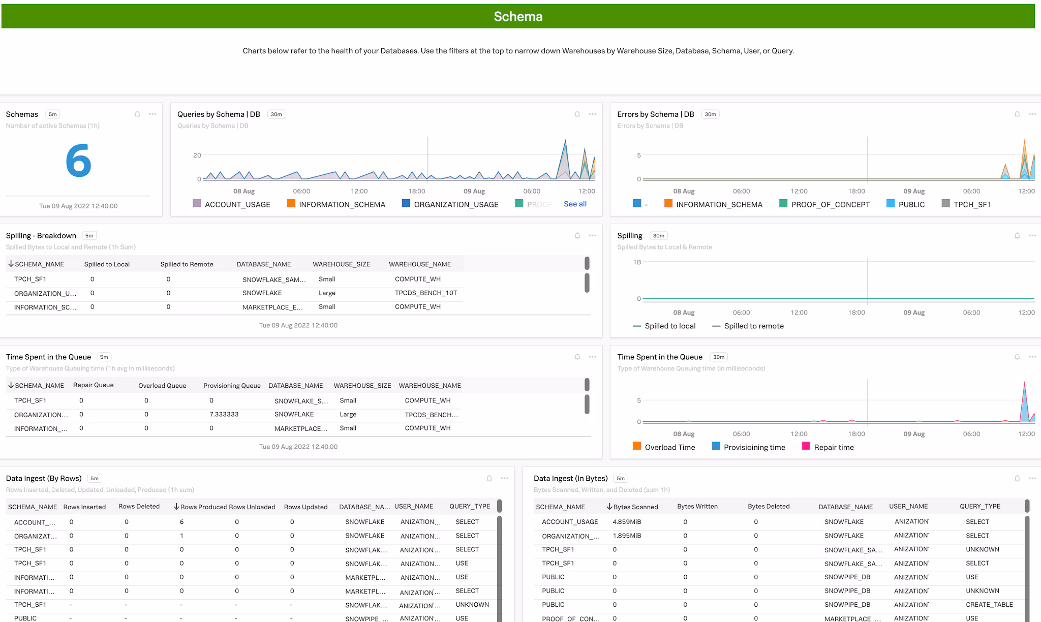 For more detailed information other Dashboards focused on Warehouses, Databases and Schemas are available. These help break down the specific concerns associated with Snowflake. Options to slice and dice your data by these same sorts of concerns are available to really zero in on what interests you most! Charts in these dashboards focus more on trends over time to help you identify changes in queries, errors, spilling, queuing and data ingest. For even greater specificity a dashboard focused on Snowflake Queries even provides a table erroring queries and associated details.