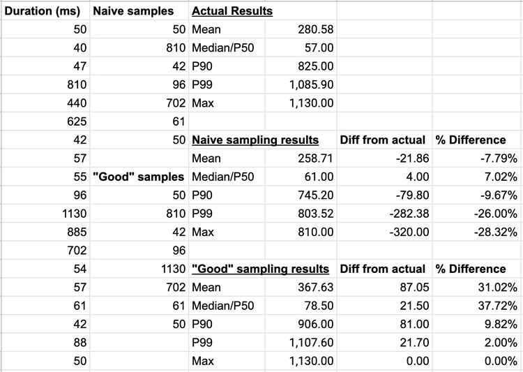 As you can see, the sampling based systems simply don’t provide you with an accurate picture of what’s happening. Both of these systems do not (and can not) show you the real state of your system. Depending on what metric you choose, sampling systems can under or overestimate duration by almost 38%! Many legacy systems were built for averages, but with modern use of SLOs and error budgets, averages aren’t as useful anyway. Percentiles give you more accurate representations of the state of your services — and the sampling systems get them quite wrong in our example above.