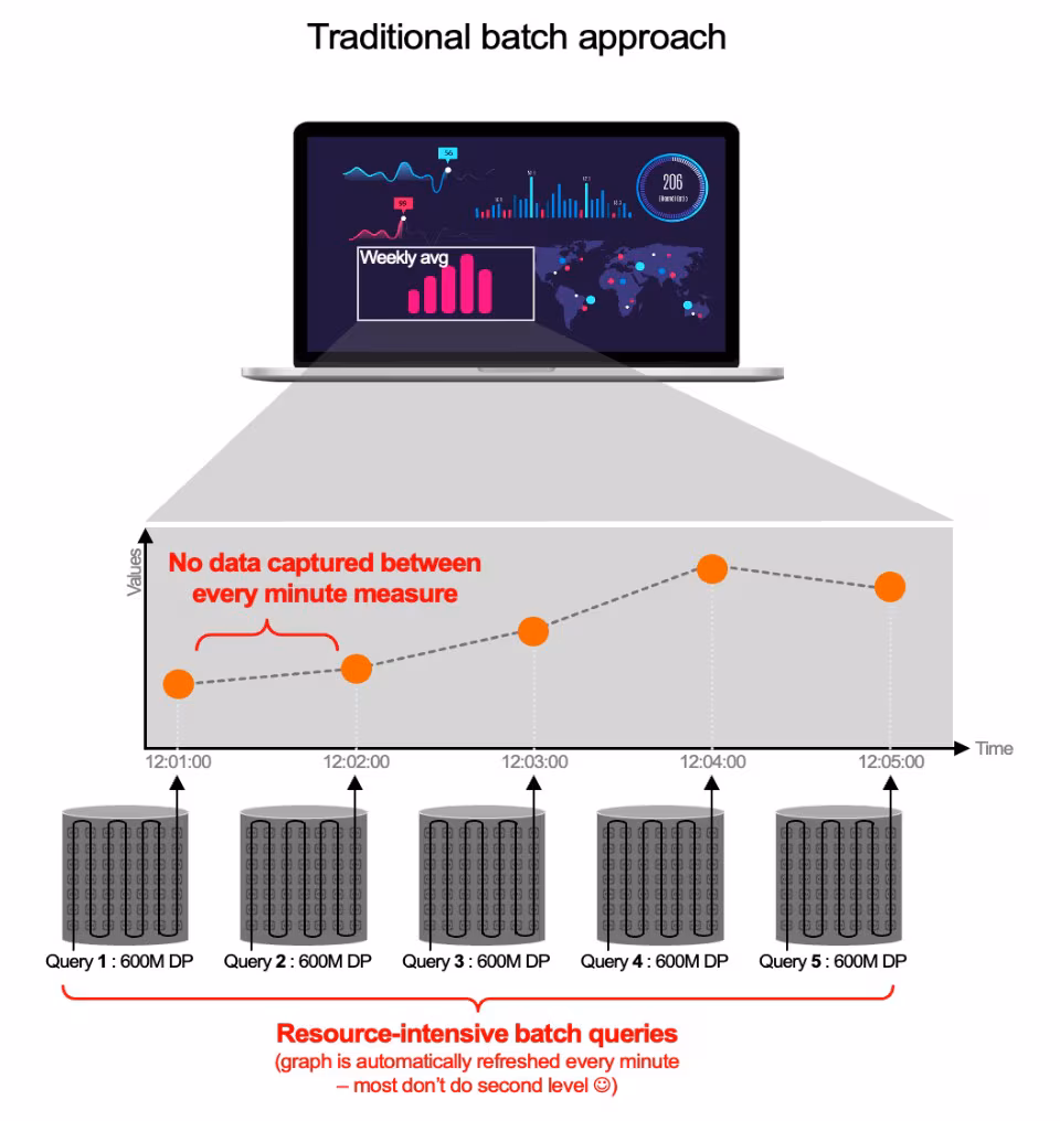 The traditional approach means that the observability solution must generate a query every minute that collects 600 million data points. Not only that but because a batch is used every minute, your environment is “unobservable” for 59 seconds!