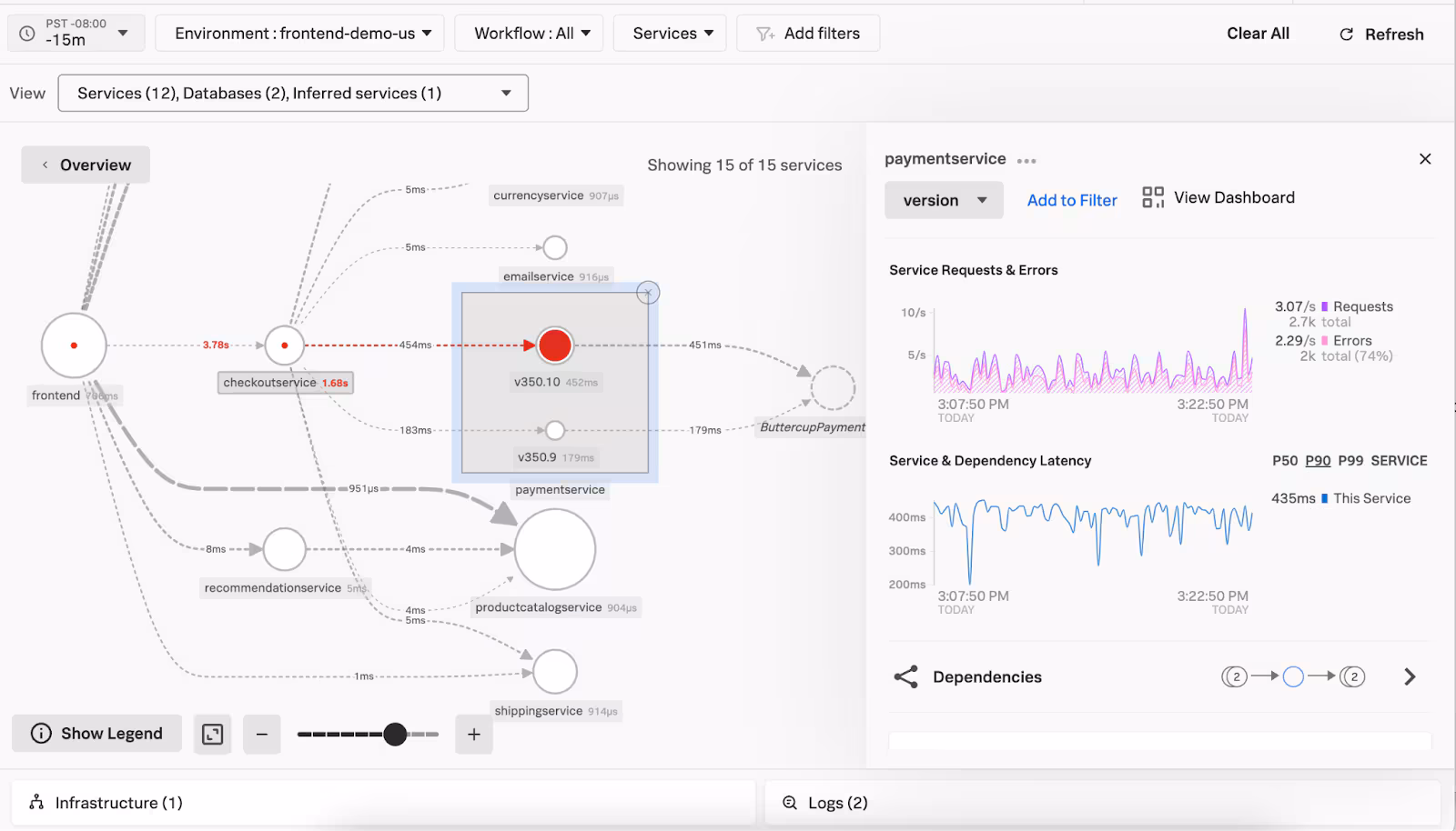 Once we do this, the service map is updated dynamically to show the performance of the paymentservice by version: