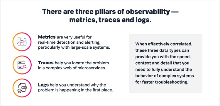 Observability gives you visibility into three key types of data: metrics, traces, and logs. Using this data, you can find out when incidents occur, locate the faulty component, then understand why the component is broken. Troubleshooting incidents requires these three types of data — each one used to understand a different part of the problem.