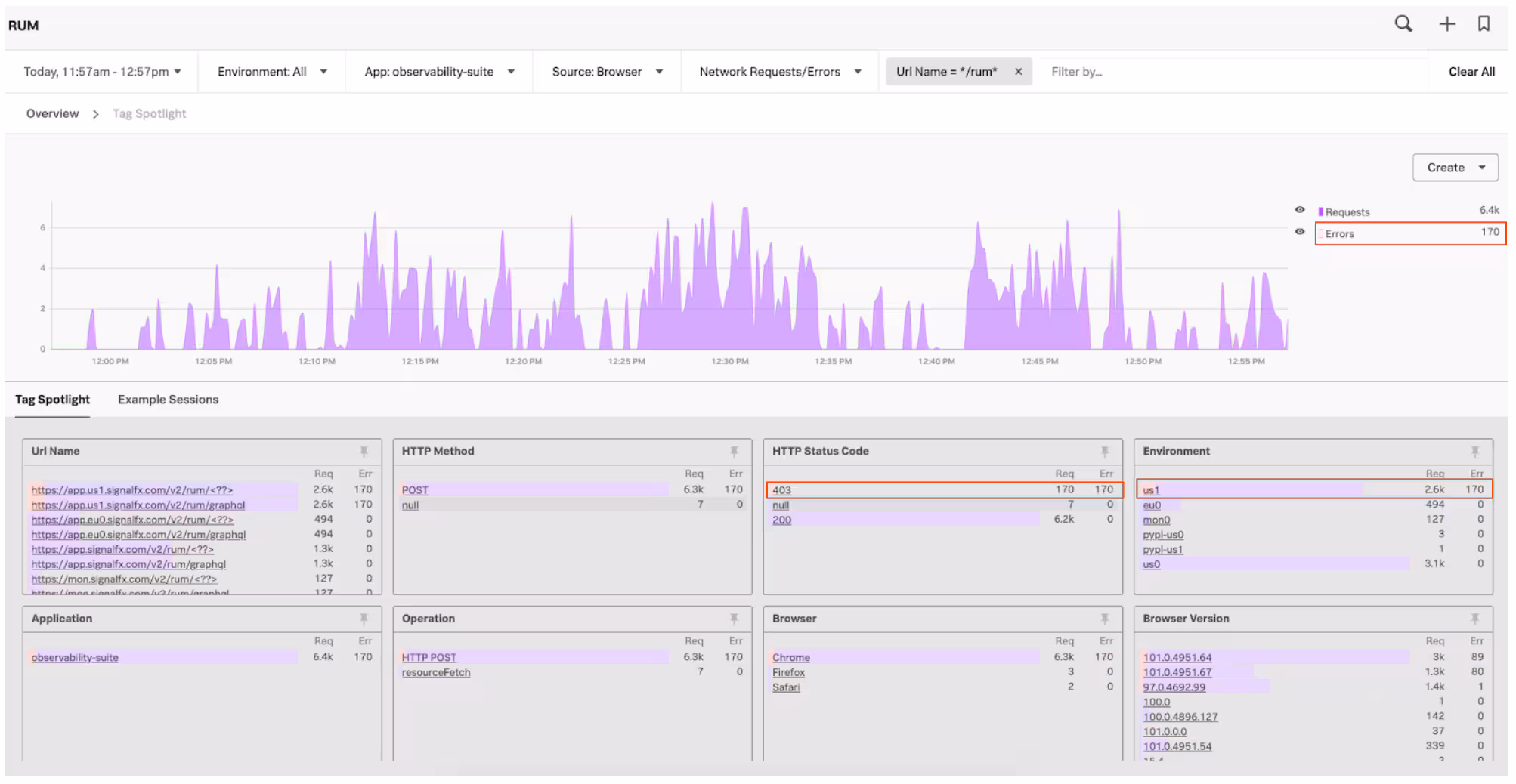 The next step was to identify the scale of the issue to update our status page for our customers. We were able to immediately pivot to Splunk RUM’s Tag Spotlight experience where we could effortlessly view the aggregate error counts on our GraphQL endpoint without scouring raw data or crafting complex queries. The Tag Spotlight experience provided a detailed analysis of the errors across several dimensions like environment, HTTP status code, application, etc. We were able to confirm that our other production environments were stable and that the problem was truly specific to the us1 environment.