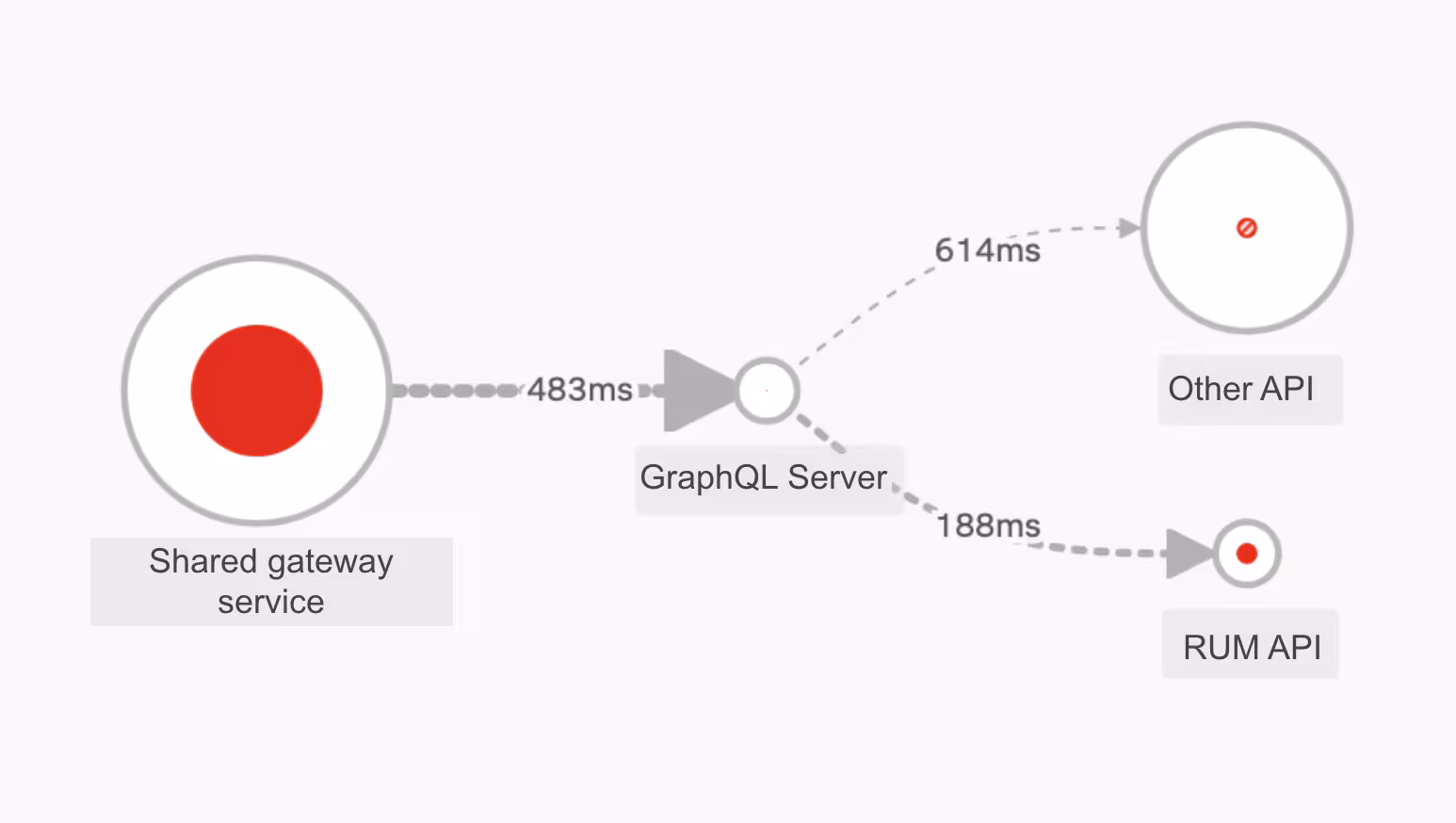 To obtain a big-picture overview of our back-end services, we opened Splunk APM’s dependency map to explore all services upstream and downstream of our shared GraphQL server. It became quickly clear that the problem was with our shared internal gateway service and not with the GraphQL server itself.