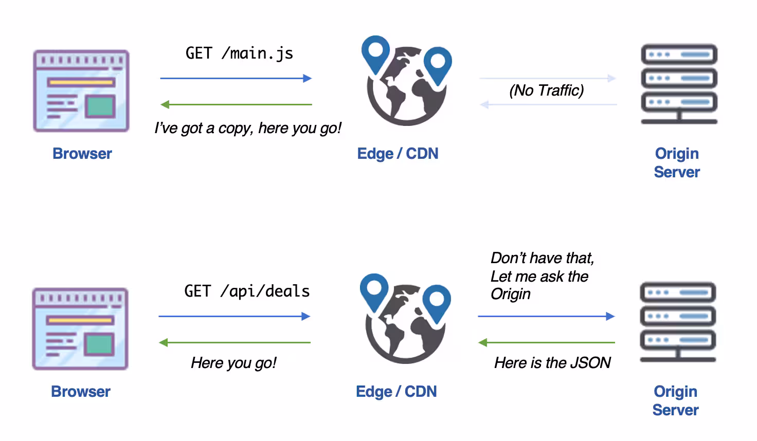 In the diagram below, we can see how the CDN sits between the site visitor and the origin server. When the browser requests main.js, the CDN already has a copy, and returns it more quickly than the origin server would have. When the browser makes an API call, the CDN passes that request through to the origin server.
