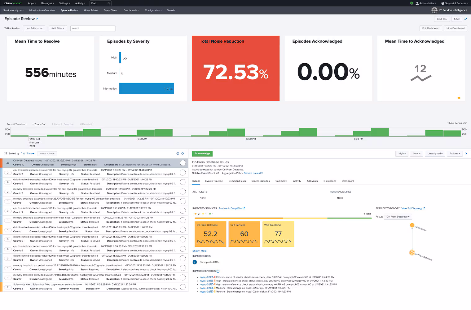 Using AI and machine learning, ITSI correlates data collected from monitoring sources and delivers a single live view of relevant IT and business services, reducing alert noise and proactively preventing outages.