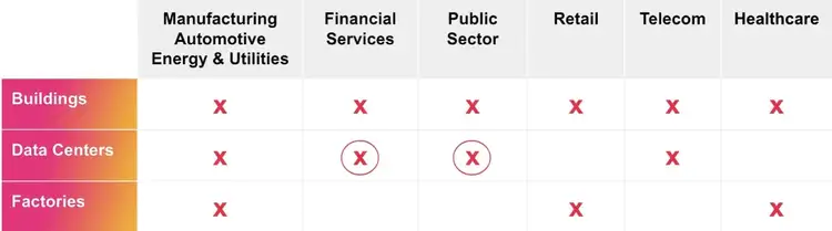 Every industry has specific priorities when it comes to energy management. Manufacturing / Automotive / Energy & Utilities organizations are the main beneficiaries of energy management since all three areas - buildings, data centers and factories, are taken into account. On the other hand, Financial Services organizations and the Public Sector have a dedicated focus on data centers since they typically operate in-house, on-premise data centers instead of migrating to the cloud.