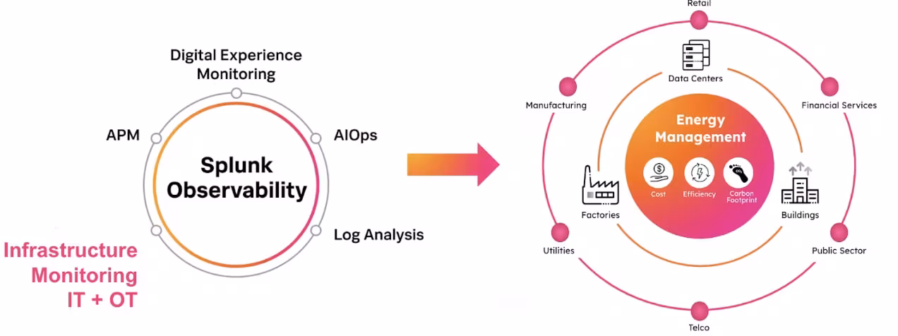 This approach unlocks a new use case in Splunk’s observability portfolio: Infrastructure monitoring across IT (Information Technology) and OT (Operational Technology) environments for unified visibility, accelerated troubleshooting and cost control. Applied to energy management, this translates into monitoring of data centers, buildings and factories across industries such as manufacturing, energy & utilities, retail, financial services, public sector, telecom and more.